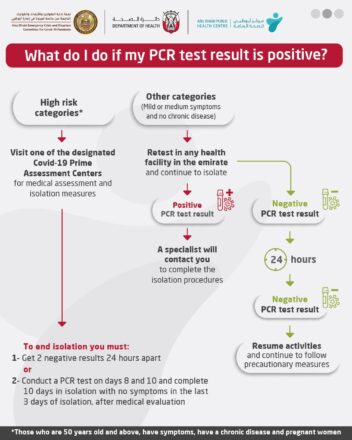 Власти также изложили процедуры для лиц с легкими или умеренными симптомами или тех, кто не страдает хроническими заболеваниями. В этом случае они должны пройти повторное тестирование в любом медицинском учреждении в эмирате, пребывая при этом в изоляции (за исключением посещения данного медицинского учреждения). Если этот тест окажется положительным, с пациентом свяжется специалист и предложит пройти процедуры изоляции.