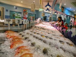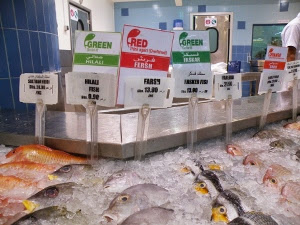 Еще один важный момент стоит отметить в нашем рассказе. Над многими сортами рыбы в отделе стоят цветные таблички, которые служат покупателям напоминанием об экологическом аспекте рыбного вопроса. Некоторые деликатесные виды слишком интенсивно вылавливаются, поэтому около них стоит красная табличка, да и цена на них повыше. Дальше – как светофор: оранжевый – внимание, а зеленый – покупайте каждый день и кушайте на здоровье! Вот такими мягкими методами пытаются в Эмиратах пробудить у людей экологическую совесть!