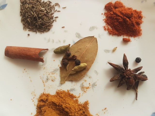 Как и в предыдущих рецептах, мы возьмем по штучке каждого вида приправы из набора Грам Масала, чайную ложку зиры, по половине чайной ложки порошка красного чили и турмерика, и готовой индийской смеси для приготовления овощей.