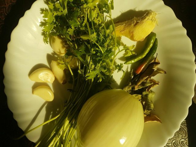 Луковица, несколько долек чеснока, зеленая перчинка чили, пучок кориандра, долька свежего имбиря, несколько листочков кари.
