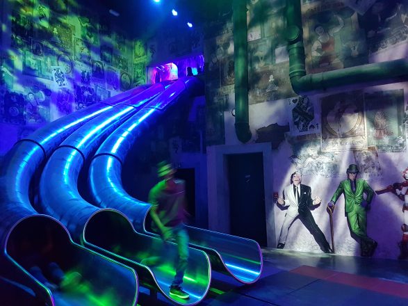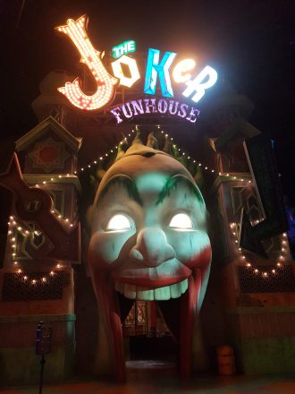 За этот день мы обошли, наверное, треть парка. Часть его отдана теме мультиков, другая супергероям. В первой понравилось и детям и взрослым, а во второй маленьким было некомфортно: там темнее, горки страшнее, аттракционы агрессивнее, требования к росту – серьезнее. Лабиринт Джокера и Дом с Привидениями дочку испугал – пришлось воспользоваться запасным выходом и убегать в слезах, отвлекаясь чем-нибудь вкусным.