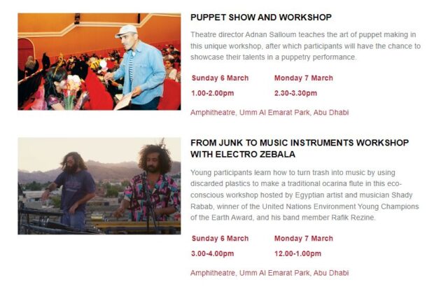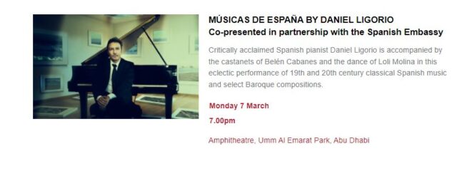 Присоединяйтесь к концертам в воскресенье, 6 и в понедельник, 7 марта, в амфитеатре Umm Al Emarat Park в Абу-Даби, где фестиваль празднует культуру и творчество серией развлекательных и образовательных мероприятий для всей семьи. Завершите день вечером под звездами, наслаждаясь музыкальными выступлениями Трио Паоло Фресу и Músicas de España Дэвида Лигорио.