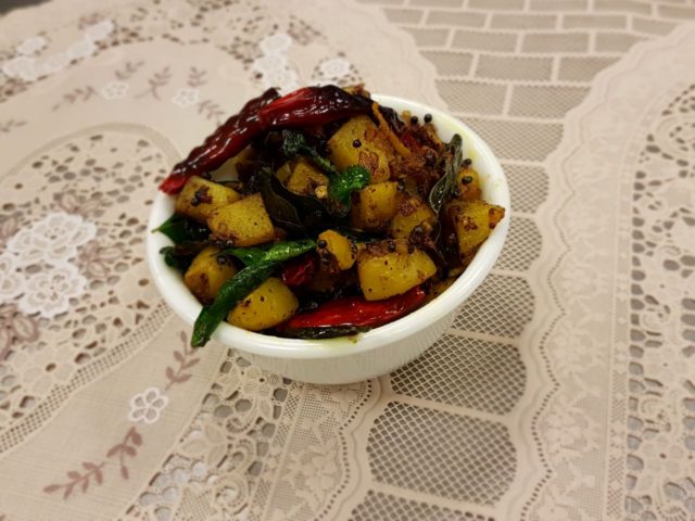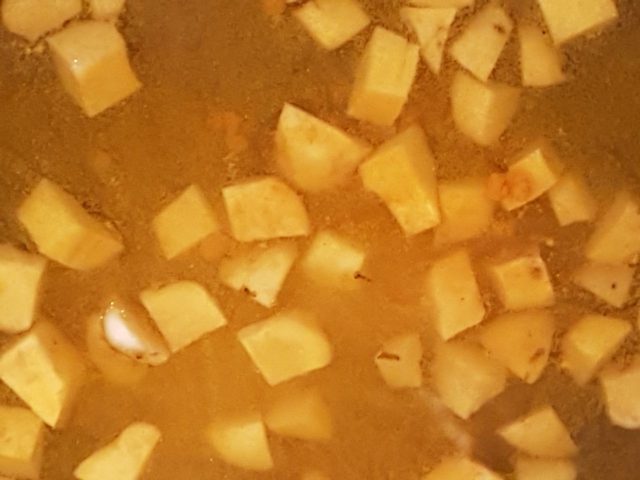 Режем их на куски и варим в воде, куда добавляем турмерик, листья карри, соль и имбирь. Клубни будут готовы через 20 минут и благодаря турмерику, приобретут приятный золотистый цвет.