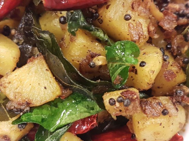 Их надо отбросить на дуршлаг. А тем временем, берем глубокую сковороду и в небольшом количестве растительного масла пассеруем мелко резаный лук с семенами горчицы, несколькими острыми перчинками, листьями карри, черным перцем. Добавляем наш картофель и свежую кинзу.