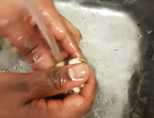 Затем тщательно промыть. Поскольку клубеньки имеют неравномерную поверхность, их придется немного дочистить ножом и лучше это сделать прямо в емкости с водой.