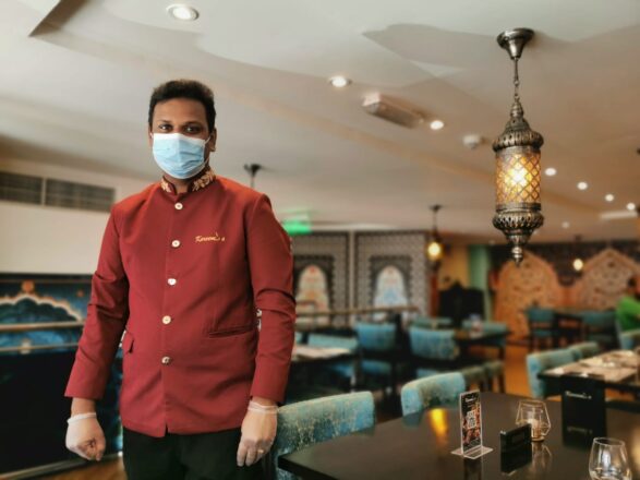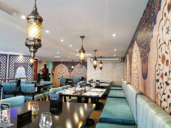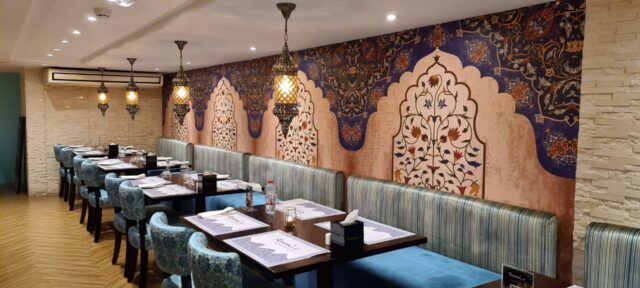 Как принято в индийских ресторанах, официанты не только советуют в выборе блюд, но и ухаживают за гостями, раскладывая их по тарелкам и подавая в том виде, как это принято веками. Интерьер заслуживает отдельного упоминания: он выполнен в арабо-персидском стиле с легкими индийскими элементами, а невысокие потолки помещения, визуально полностью компенсируются небесно-голубым цветом мебельной обивки.