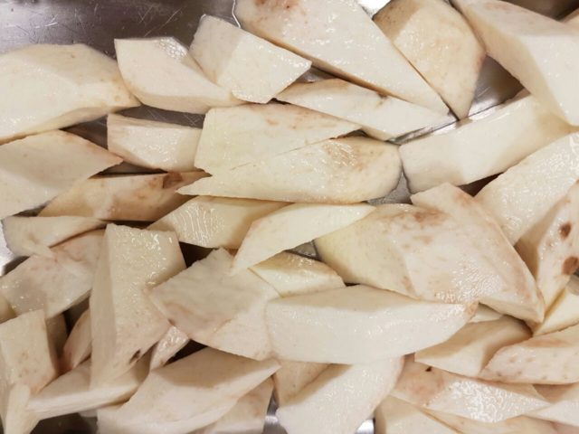 Очищенные арави нарезаем длинными дольками и, слегка обваляв в крахмале, обжариваем в кипящем масле на сильном огне.