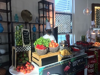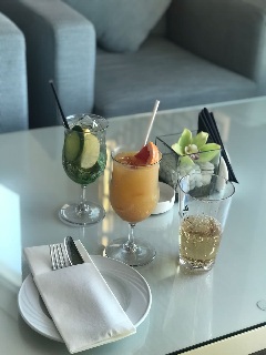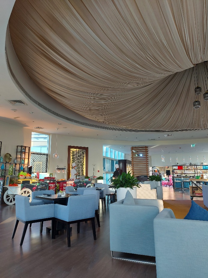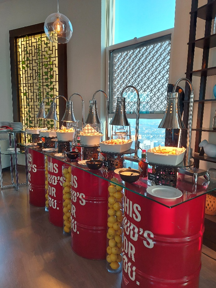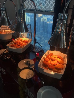 При входе в великолепный просторный лаунж, сразу легко создать себе настроение, прихватив со стойки цветные очки и цветочные гирлянды. Внутри вас ждут мягкие диваны, удобные кресла и 360 градусов захватывающих видов города. А по всему залу, небольшие островки разных закусок и несколько передвижных кухонь, где любезные повара готовят вам свежие буритос, хотдоги и другие интересные блюда.