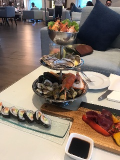 Здесь, в прохладе, сидя в мягком кресле, вы выбираете себе напитки, а расторопные официанты приносят вам к столу свежайшие морепродукты, нарезку мяса украшенную каперсами, корнишонами и овощами.