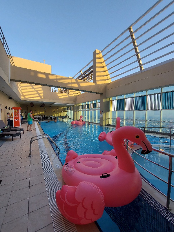 А в бассейне уже кипит веселье. Две красавицы – ди-джей и саксофонистка постепенно разогревают атмосферу. И не забудьте, этот бассейн находится на крыше и только прозрачное стекло отделяет вас от пролетающих мимо птиц.