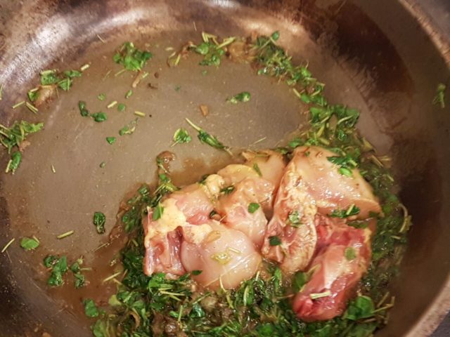 Берем сотейник и в разогретое растительное масло кладем измельченный лук, семена кемуна, соль, порошок семян кориандра и куркумы. Выкладываем курицу и хорошенько обжариваем, не уменьшая огня, минут пять.