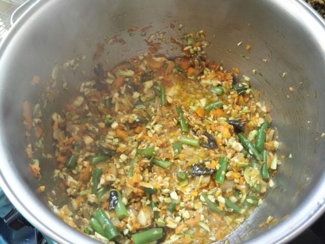 Приправы – листья кари и турмерик, зира, зеленый маленький перец-чили, и немного порошка из пакета Индийской смеси для овощей. Всего понемногу – на вкус.