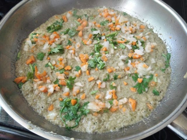 На тефлоновую сковороду, смазанную маслом, наливаем полусантиметровый слой и сверху насыпаем измельченные лук (1), морковь (1) и свежий кориандр.