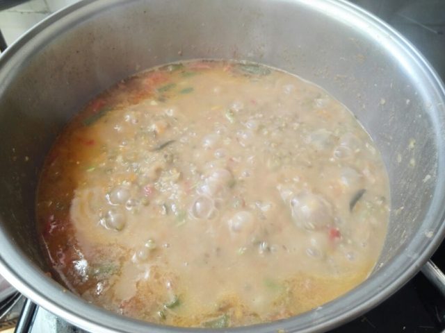Добавляем воду, измельченные кубиками овощи, помидоры – последними. Оставляем кипеть на сильном огне 15 минут и выкладываем туда уже отваренные мунг бин, вместе с водой, в которой они варились. Оставляем кипеть еще 10-15 минут, периодически интенсивно помешивая.